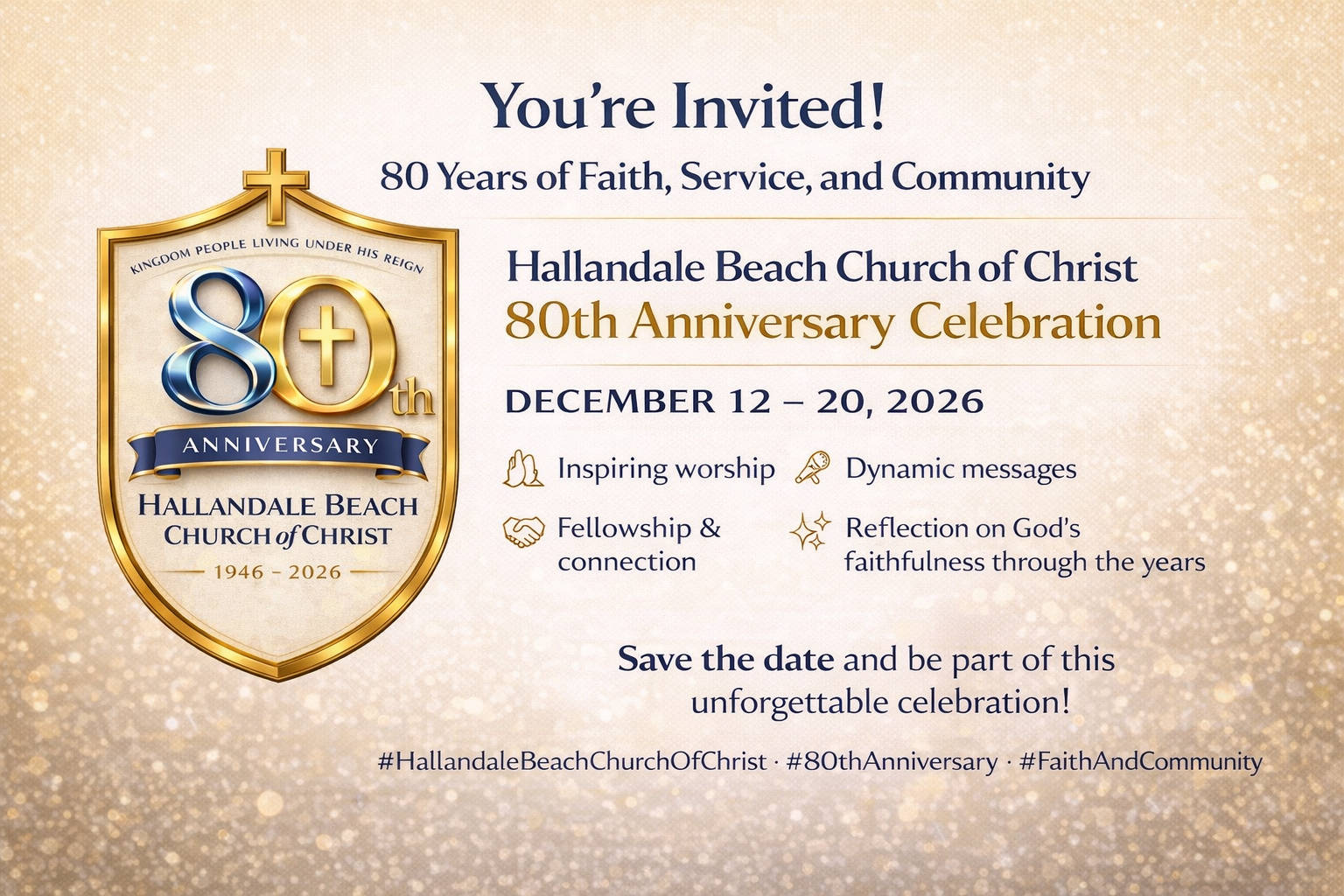 305 N Dixie Hwy, Hallandale Beach, FL 33009 Hallandale Beach Church of Christ Directions 80th Anniversary Celebration Date December 12 – 20, 2026